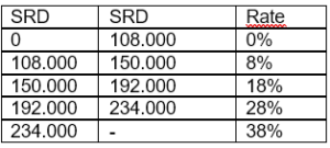 The tax-free amount currently amounts to SRD 108,000 per year (and SRD 9,000 per month). For the calculation of the wage tax, the tax-deductible professional expenses for calculation purposes remains at SRD 4,800 maximum per year (SRD 400 per month). No additional Personal Income tax is levied when employment is a person’s sole source of income.